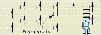Первый шаг — перемещение линейки по всей длине поверхности деревянной панели. Просветы между линейкой и панелью укажут на низкие и высокие точки. Карандашом делаем метки в высоких местах через 10-15 сантиметров, как показано на рисунке выше слева.