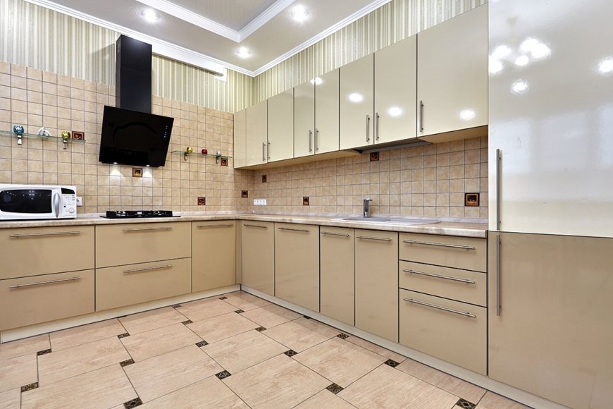 Для рабочей зоны кухни необходимо подбирать практичное напольное покрытие: влагостойкий ламинат высокого класса износоустойчивости, кафельную плитку или линолеум. Для обеденной зоны можно применять менее износоустойчивые материалы: недорогая модель ламината, линолеум или паркет. Различные напольные покрытия должны сочетаться по цвету. Можно уложить на разных зонах одно и то же покрытие, например, влагостойкий ламинат, но отличающееся на пару тонов.