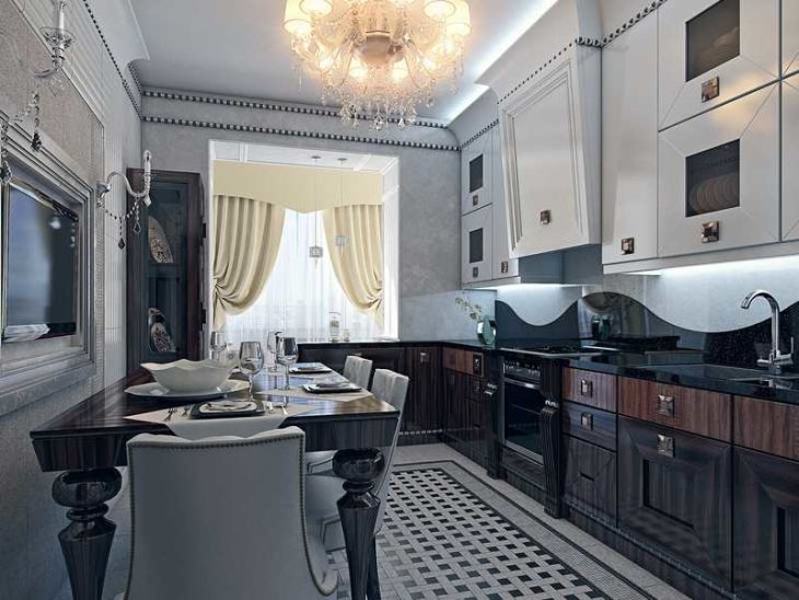 Обстановка в стиле ар-деко – это всегда роскошь, дорогие натуральные материалы, глянец и позолота. Однако к ним обязательно следует прибавить безупречную функциональность всех предметов интерьера, в том числе и кухонного гарнитура.