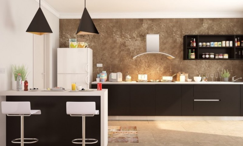 - При отделке стен желательно вовсе отказаться от обоев с мелким рисунком, а отдавать предпочтение венецианской штукатурке или бамбуковому покрытию. Благодаря таким материалам уборка не займет много времени, а кухня будет выглядеть чисто и опрятно.