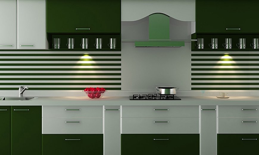 Отдельных источников искусственного освещения требует зона, предназначенная для приготовления пищи. Рабочая поверхность и плита освещаются точечными светильниками или светодиодной лентой. Крепятся элементы освещения к нижней части настенных модулей гарнитура.