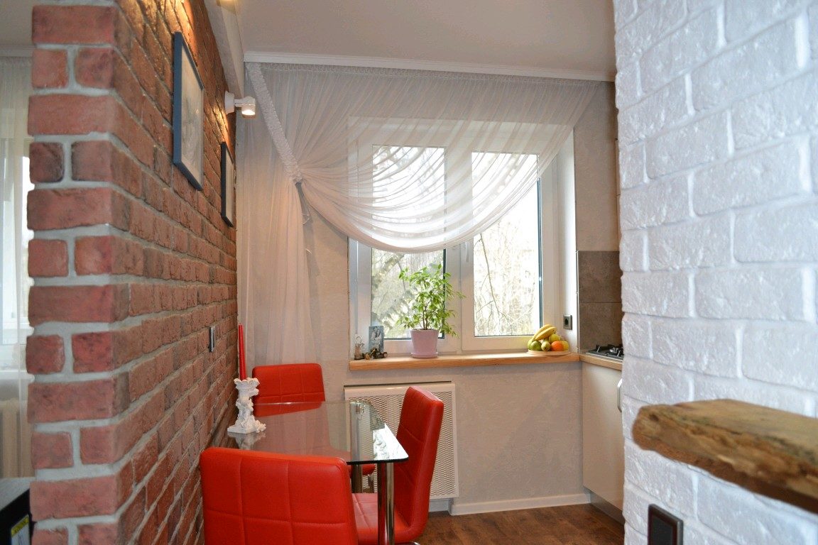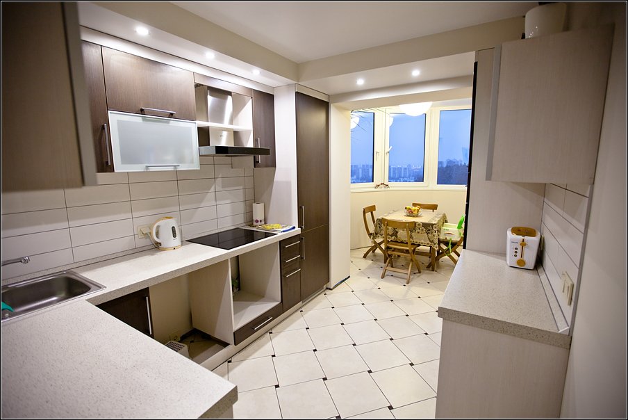 - Объединением с балконом. Для этого проводят демонтаж балконной двери и оконного проёма. На балконной части можно расположить обеденную зону или зону отдыха с диваном, установить там холодильник или дополнительные шкафы для хранения закаток и редко используемой посуды.
