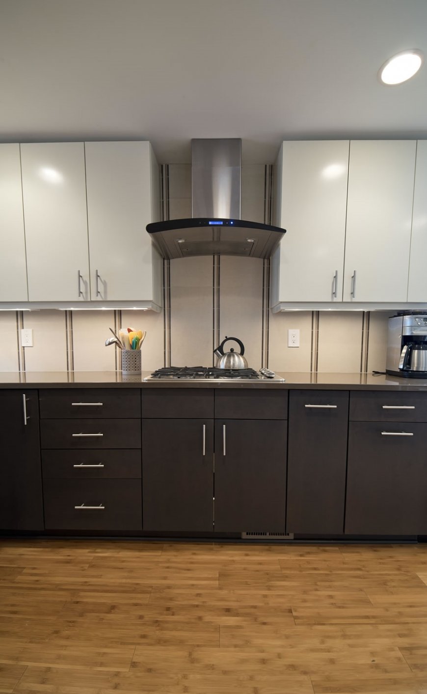 Одно из основных правил в оформлении кухонного интерьера – сочетание светлого верха и темного низа. Нижние полки, столешницы на два-три тона темнее, чем верхние, даже если вы выбрали преобладающий один цвет.