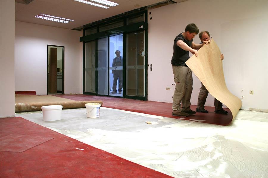Затем полосу складывают пополам и равномерно намазывают клеем для линолеума. Можно использовать валик или широкую кисть. Перед тем, как стелить покрытие, ему дают полежать промазанным минут 15-20 для того, чтобы клей впитался. За это время покрывают клеем основание пола.