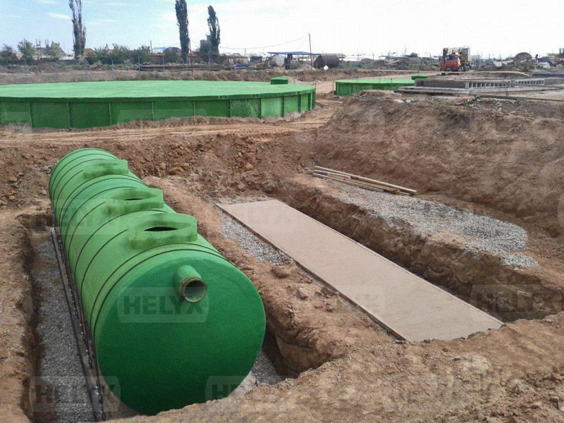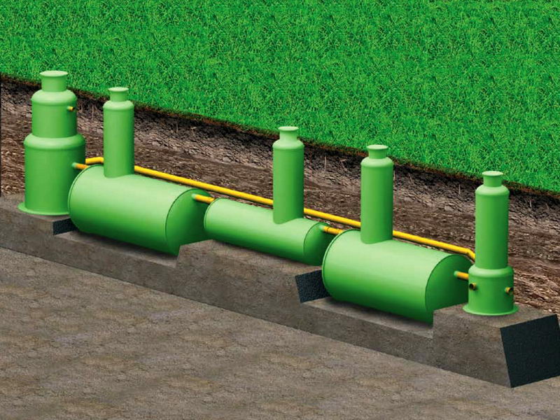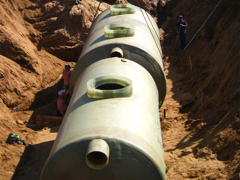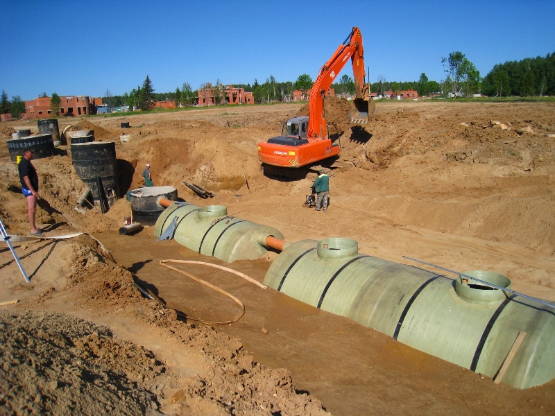 После выполнения вышеуказанных действий требуется произвести тестирование и засыпать комплекс песком. В конце уложить грунт. При необходимости можно смонтировать сооружение наземного типа. В этом случае откачка будет производиться насосными станциями. Данный вариант пригоден для зон, где нет возможности производить масштабные раскопки — бетонированные участки города, площади со сложным составом почвы.