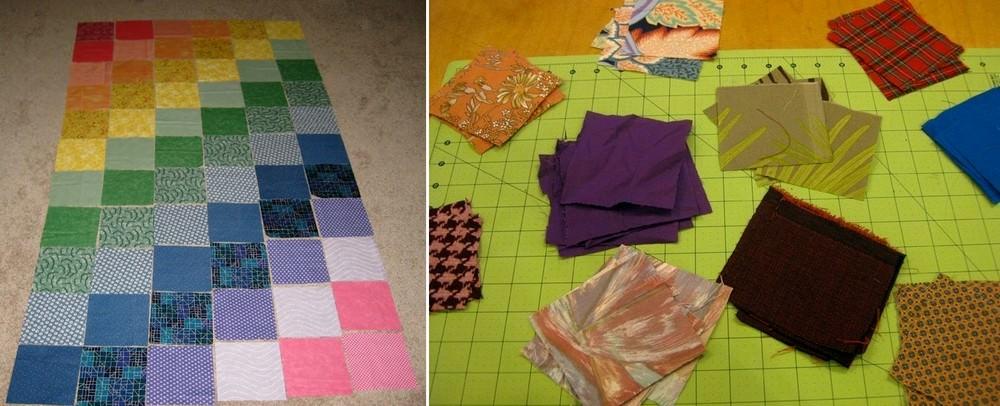 После того как из одноцветных квадратов будут сделаны разноцветные лоскутные отрезы перед Вами стоит задача подровнять их так, чтобы все их стороны были равны 32 см. Затем можно приступать непосредственно к «сборке» одеяла, а точнее, его пошиву.