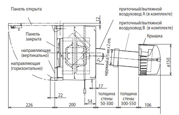 Модель VL-100EU5-E устанавливается на стене. Воздух подается через два отверстия в стене диаметром 85-90 мм. Расход воздуха может регулироваться (высокий и низкий). В комплекте с прибором VL-100EU5-E поставляются аксессуары для монтажа. Для управления вентустановкой VL-100EU5-E применяются выключатель (ВКЛ/ ВЫКЛ) и переключатель (ВЫСОКАЯ/НИЗКАЯ скорость вентилятора) сторонних производителей (в комплект поставки не входят) .