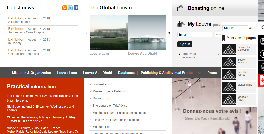Необязательно пользоваться услугами гидов и турфирм, чтобы посетить Лувр: на официальном сайте есть все необходимое, чтобы подготовить визит самостоятельно. В музее, кроме стационарных экспозиций, ежедневно проводятся интересные мероприятия, такие как панельные дискуссии, концерты, кинопоказы, конференции, мастер-классы, выставки, перформансы. Их расписание есть в третьем разделе сайта, с указанием места проведения и описанием условий посещения.