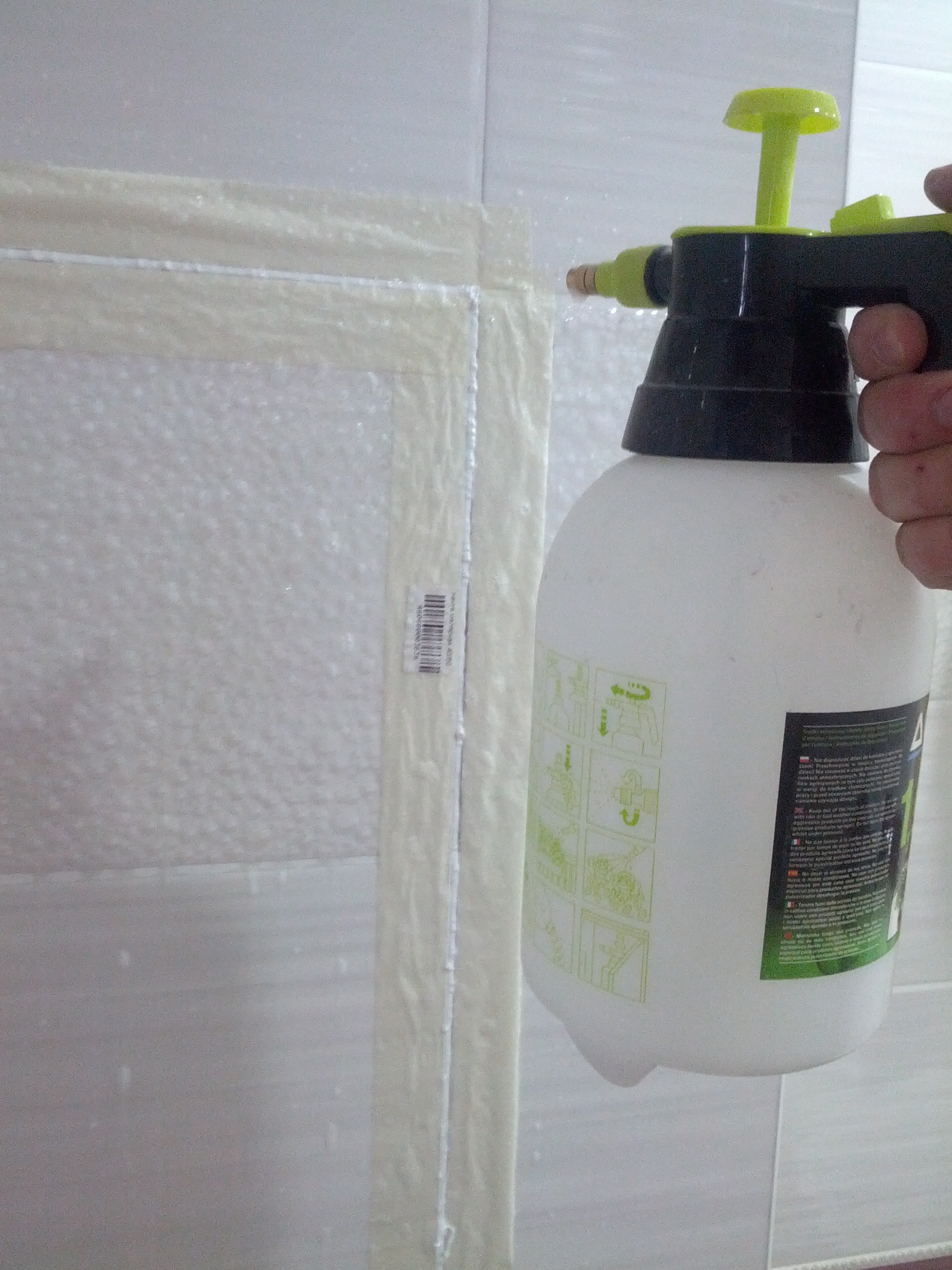 Чтобы силиконовый герметик не оставлял лишних следов на плитке обработаем всю поверхность мыльным раствором из пульверизатора