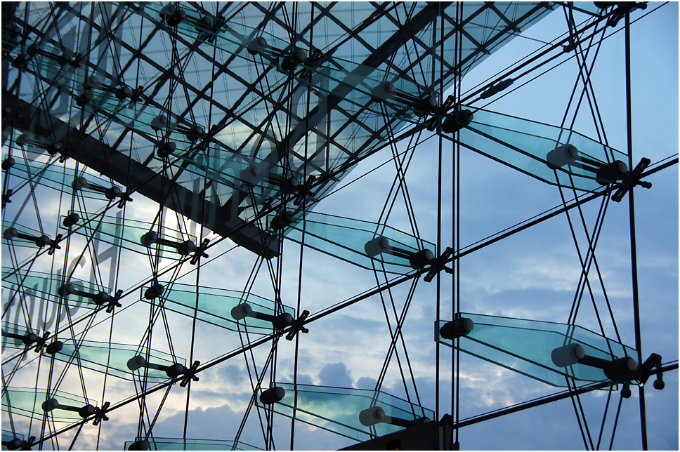 Стеклопакеты удерживаются в проектном положении при помощи стальных стержней и тросов небольшого диаметра. Сложная система, которая не так часто применяются для устройства светопрозрачных фасадов.