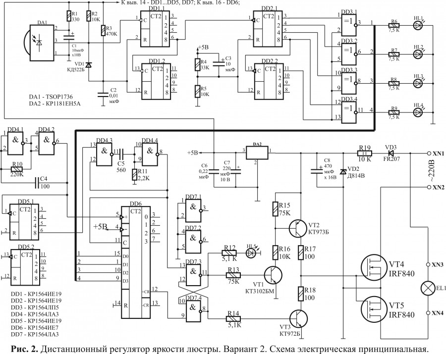 На схеме показан случай для двух групп ламп люстры. Если подключить несколько люстр к контроллеру, то появится возможность управлять каждой из них по отдельности или всеми одновременно.