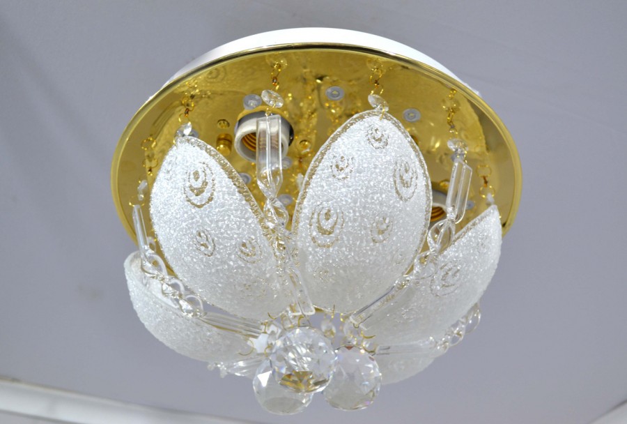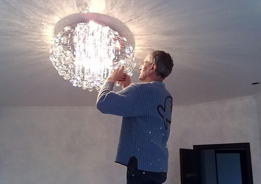 Казалось бы, что такого? Однако, при установке светодиодной люстры добрая половина рабочего времени уходит именно на сборку и подготовку люстры к установке. На все блестящие детали обычно наклеена плёнка от грязных лап и царапин. Нужно всё раскрутить, снять плёнку, прикрутить и вставить стекляшки и брюлики, (в некоторых моделях используются кристаллы Сваровски)). Потом вставить лампочки.