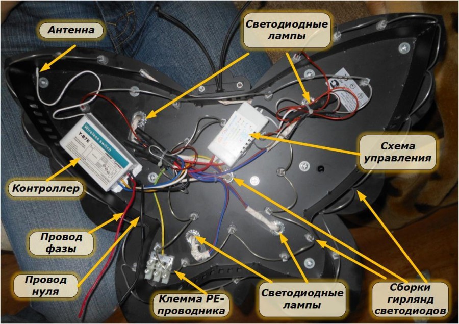 Для превращения простой люстры в люстру с дистанционным управлением, достаточно отсоединить от клеммной колодки провода, идущие на лампочки. К клеммной колодке подключить контроллер, а к его выходу провода, идущие на лампочки, как показано на схеме.