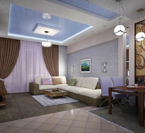 Посмотрите и вы – на фото представлены тканевые натяжные потолки в зале с люстрой и светильниками разных типов.