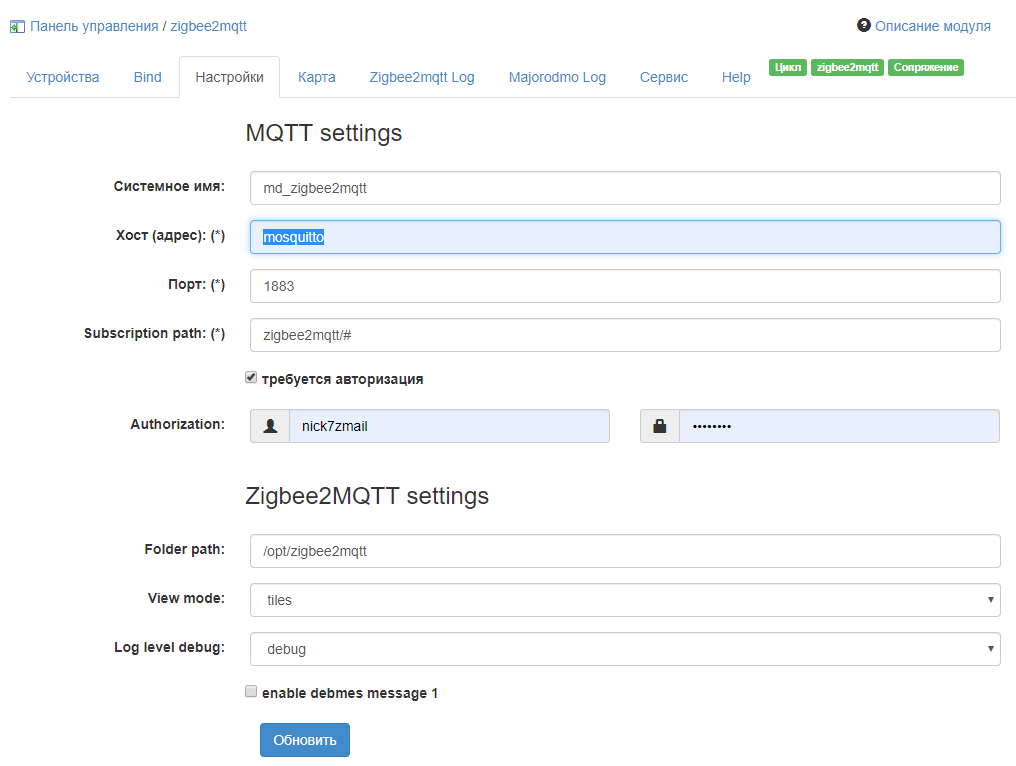 Как вы, наверное, успели заметить в том же портэйнере отображаются адреса контейнеров. По скольку контейнеры это изолированные среды, а изолированные среды должны как то общаться между собой и с пользователем – связывает их виртуальная сеть, поднятая прямо на сервере. У сети есть своё пространство имён, каждый контейнер имеет свой адрес. Нет, есть, конечно, и другие типы интерфейсов сети, но о них я не упоминаю, т.к. в текущей статье использовался только тип интерфейса bridge. Если мы обращаемся к приложению в контейнере прямо с серверной машины – надо обращаться не к localhost (127.0.0.1), как мы привыкли это делать, а к ip адресу, присвоенному контейнеру. Так же некоторые контейнеры позволяют для подключения использовать DNS имя, чем мы собственно и воспользовались при настройке mosquitto и mariadb. Например чтобы подключиться модулем zigbee2mqtt к брокеру mosquitto надо указать примерно следующие настройки