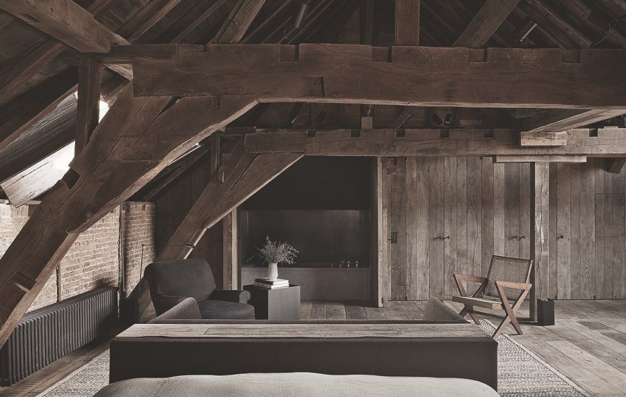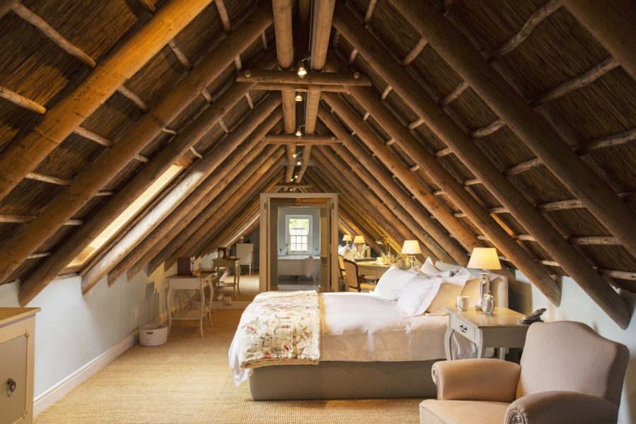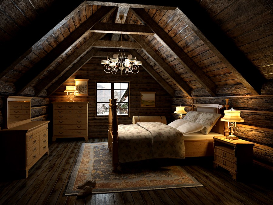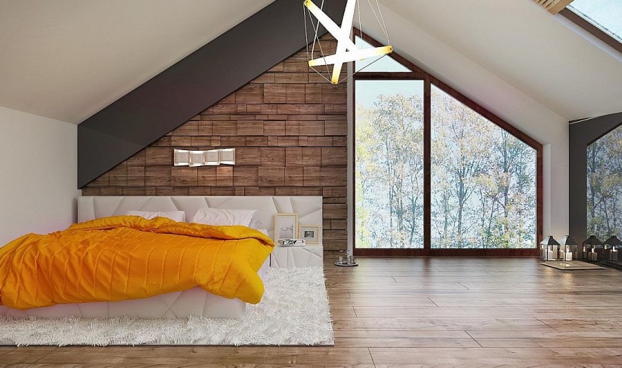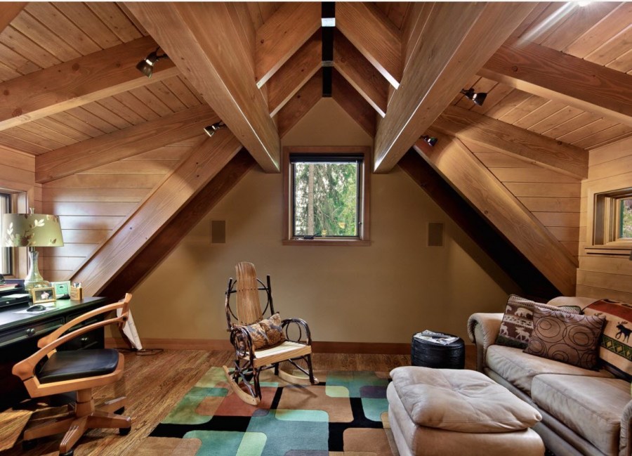 Старайтесь акцентировать внимание на окнах и необычной форме крыши, потолочные балки будут отлично смотреться в темных тонах.