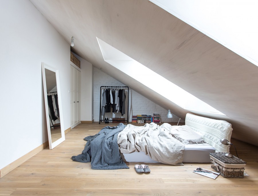 В силу наклонных стен не получится использовать обычный платяной шкаф, хорошей альтернативой станет встроенная мебель, выполненная как одно целое со стеной.