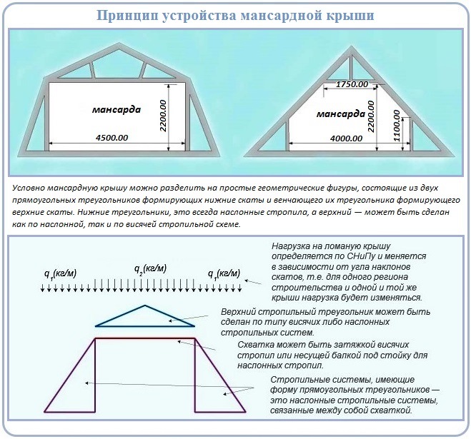 Если для упрощения разрез мансардной крыши разделить на две половины, внизу получится трапеция, а вверху треугольник. Наклонным сторонам трапеции разрешено быть исключительно наслонными, а сторонам треугольника наслонными и висячими.