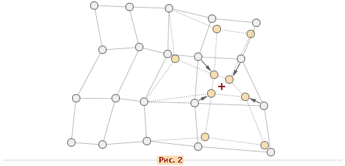 После того, как найден нейрон-победитель производится корректировка весов нейросети. При этом вектор, описывающий нейрон-победитель и вектора, описывающие его соседей в сетке перемещаются в направлении входного вектора. Это проиллюстрировано на рисунке 2 для двумерного вектора.