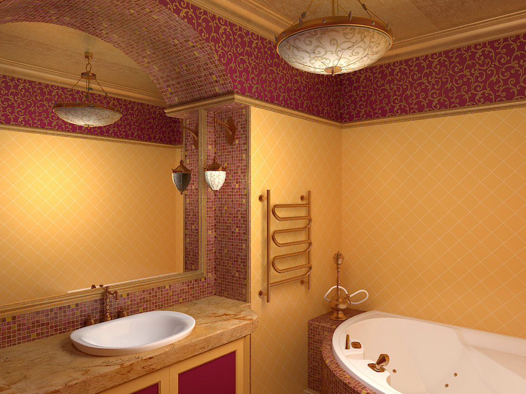 С ванной дело обстоит сложнее. По форме она никак не напоминает те, к которым мы привыкли. Это скорее небольшой бассейн с массивными бортиками прямоугольной формы. Не очень удобно для нас, но отражает дух стилистики. Вдобавок ванна существует в помещении как отдельный самостоятельный элемент, который нужно обязательно отделить от остального пространства. Делается это либо с помощью перегородок и проемов, либо с помощью арок и шкафчиков. Все эти способы, разумеется, богато украшены резьбой или расписаны орнаментом.