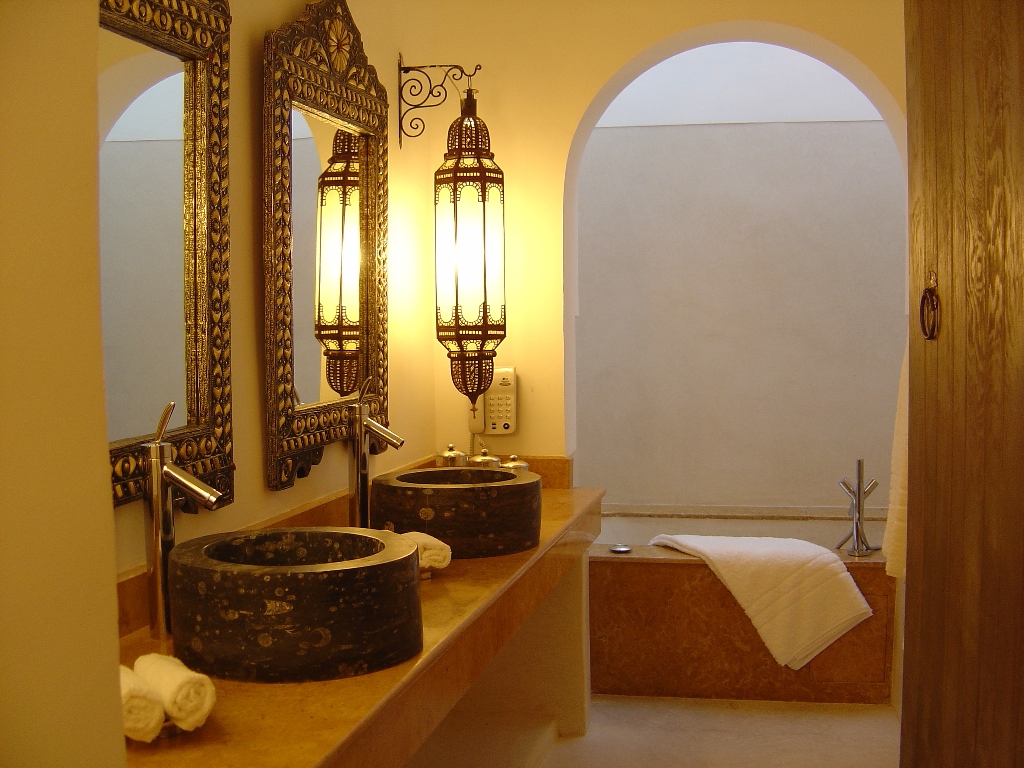 Для этой версии подойдет особая сантехника. Стилистику будет отражать ванная прямоугольной формы с массивными бортиками, которую необходимо отделить с помощью деревянных перегородок, элементов мебели, арок, проемов. Недопустимо использование дешевых аксессуаров в виде пластиковых карнизов, полиэтиленовых шторок. Марокканский стиль олицетворяет также массивная раковина круглой формы. Она может быть металлической, каменной или фаянсовой грубой обработки. При отделке помещения нужно избегать дешевой подделки. В данном случае нарочитая простота добавляет баллов натуральности.