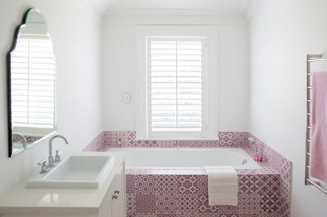 Зона ванны красиво оформлена бело-розовой плиткой зелидж