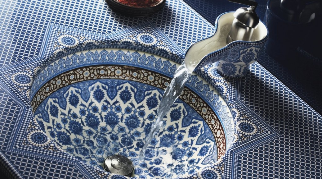Если уж Вы хотите использовать привычную керамическую плитку для отделки, то помните, что марокканский стиль приемлет использование плитки максимального размера лишь 15х15см с ярко выраженным восточным рисунком. Причем орнаменты, рисунки и вязь арабской стилистики используются в ванной комнате везде, где только можно себе представить.