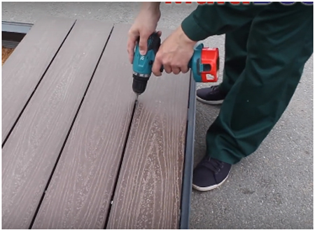 Крепится уголок к террасному покрытию саморезами, для которых предварительно делаются отверстия.