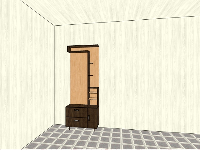 Первую неделю я изучал теорию по видеоурокам. Затем освоил программу PRO100, для проектирования мебели и начал накидывать эскизы будущей мебели, которую хотел изготовить. Сделал шаблон, необходимый для работы. Для начала хотел изготовить пенал в ванную комнату и прихожку в коридор. После того, как моя любимая одобрила проекты, приступил к воплощению задуманного. Это один из эскизов прихожки, который я сделал в программе PRO100. Если кто-то не сможет найти данную программу, напишите в комментарии, вышлю Вам на почту.