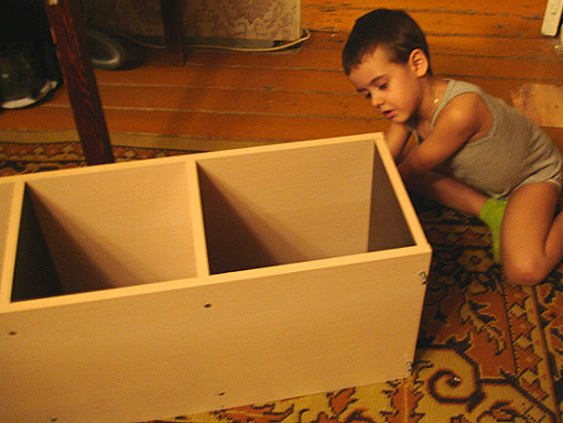 Благодаря шаблону, разметка прошла быстрее, легче и точнее. К сожалению момент разметки не фотографировал, делал отверстия под конфирматы по видео, которое выложил выше. Совместив отверстия в деталях, вставил конфирмат и скрепил всю конструкцию. Осталась только эта фотка, как мы со старшим сынишкой собирали пенал для ванны.