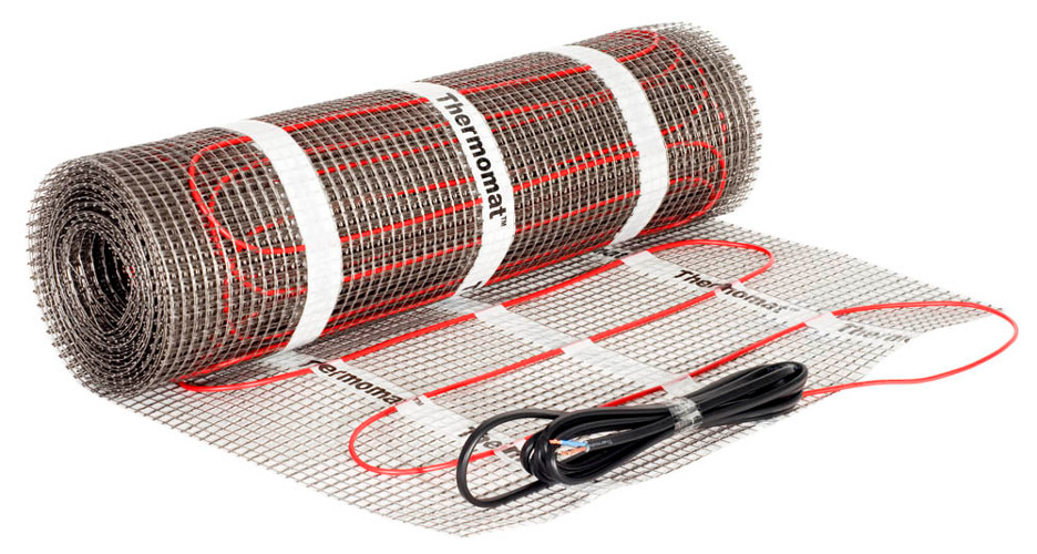 Один из самых современных и функциональных вариантов теплых полов — это, безусловно, термоматы. Такой тонкий кабель (диаметром до 4,5 мм, не толще), особым волнообразным образом закрепленный на специальной сетке из стекловолокна, ширина которой составляет полметра. Собственно нагревательная жила в таком кабеле экранирована, а также изолирована и защищена внешней оболочкой.