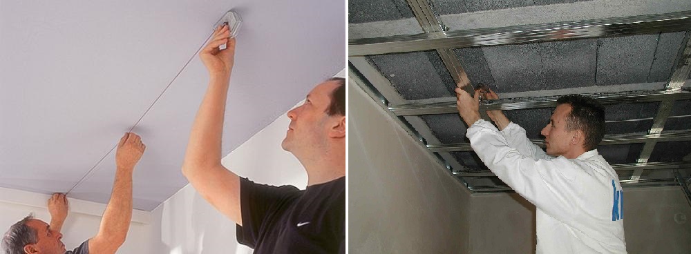 Сперва размечается линия, по которой пройдет плоскость потолка. Нужно разместить ее на таком уровне, чтобы в пространстве, которое останется над его плоскостью, поместились встроенные потолочные светильники и все коммуникации, типа воздуховодов и проводки.