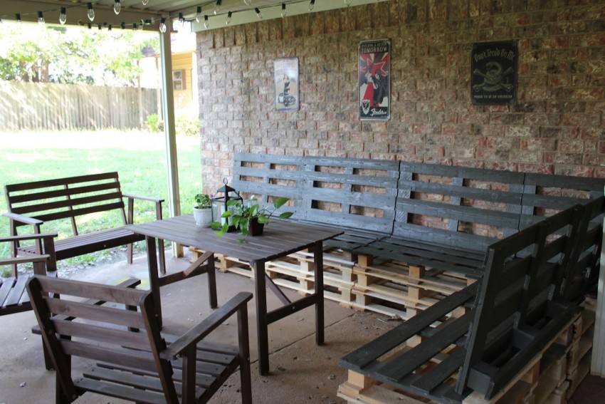 Почему бы не сделать удобный уголок на веранду или в беседку из паллетов? Вам кажется это слишком сложным? На самом деле все очень просто. Для этого вам нужно найти приблизительно 9 поддонов. Конечно, все зависит от размера уголка, поэтому количество расходного материала можно корректировать. Также понадобится лист фанеры, поролон и плотная ткань.