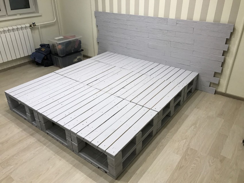 Кровать из поддонов отличается простотой конструкции, и изготовить ее довольно легко. Для этого понадобится 4 европоддона + 2 поддона для изголовья (если оно будет присутствовать), шуруповерт, грунтовка по дереву, лак или краска, металлические пластины или уголки.