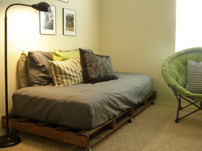 Такую кровать можно поставить и в дачном домике и на свежем воздухе. Это замечательный вариант для сна и дневного отдыха. Стоимость такой кровати намного меньше, чем полноценной мебели, поэтому такое изделие доступно всем. Чтобы сделать кровать необходимо лишь соединить поддоны между собой, покрыть их лаком или краской, и купить хороший матрас.