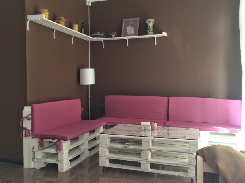 Вначале три паллета устанавливаются так, чтобы получилась буква Г. Теперь на них устанавливаются еще по одному поддону и прочно скрепляются шурупами или гвоздями. Теперь делается спинка: три паллета устанавливаются боком у основания и также прочно соединяются. На сиденье и спинку прибивается фанера. Чтобы сидеть на уголке было удобно, его необходимо сделать мягким. Для этого поролон прикрепляется к деревянной поверхности при помощи степлера. Осталось декорировать мебель при помощи ткани. Также можно добавить ножки.