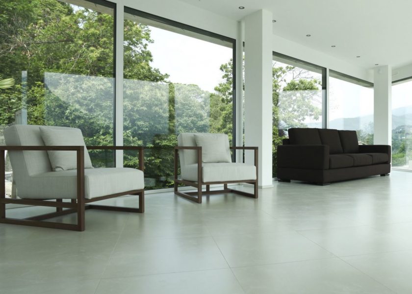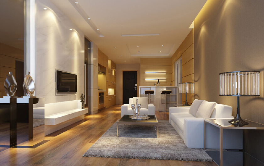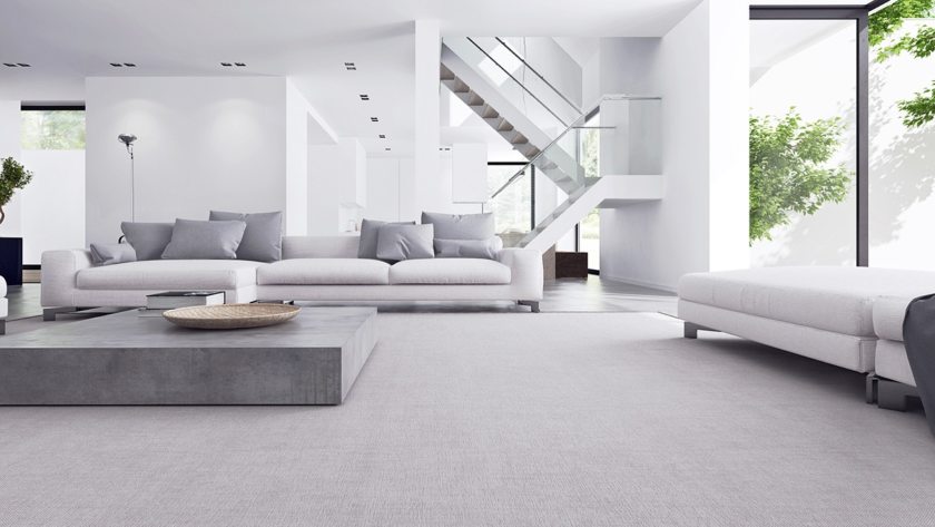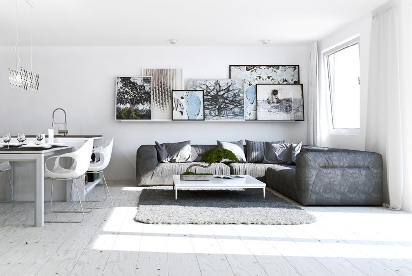 В основной набор мебели для гостиной в минималистическом стиле входит диван и журнальный столик.