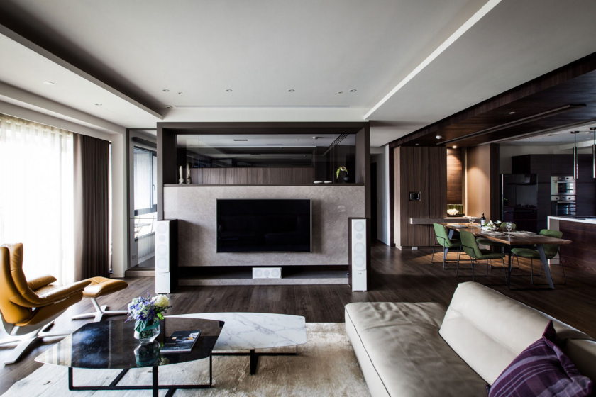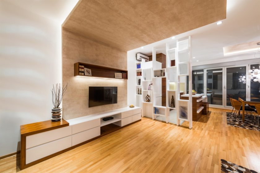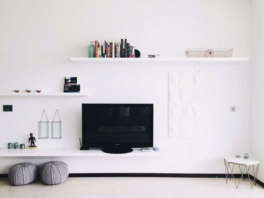 Современная корпусная мебель в стиле минимализм примечательна тем, что она имеет множество полок, отсеков и ниш, скрытых зеркальными дверями – купе. Открытой обычно остается только ниша, предназначенная для телевизора.