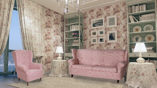 Изысканный и немного наивный стиль никого не оставит равнодушным. Элегантная мебель, натуральные ткани, милые декоративные вещички из фарфора прекрасно вписываются в сельский интерьер. Можно выделить несколько особенностей дизайна: