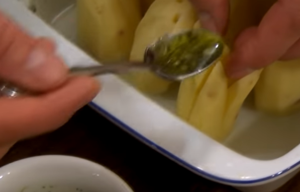 Теперь в масло высыпаем прованские травы вместе с солью и перцем, размешиваем и получившийся соус вливаем в каждый разрез картофеля.
