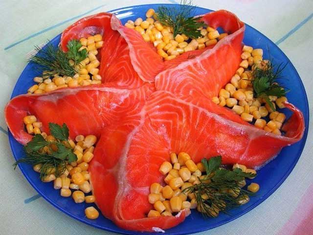 Кстати, этот же салат можно оформить и другим красивым способом, в виде морской звезды. Выглядит он также очень красиво. И поставить такой на праздничный стол вполне уместно!