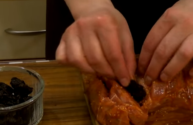 Получившимся маринадом щедро обмазываем мясо, а затем в каждый разрез кладем хорошо промытый и просушенный чернослив.