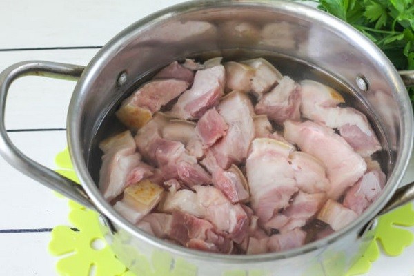 3. Налить воду в емкость для варки. Довести до кипения. Спустив в кипяток куски свинины, варить ее около трех – пяти минут с момента закипания.
