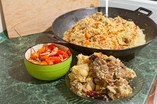 10. В центре сделать углубление. Положить в него кости, чеснок, перец, зиру и ягоды барбариса. Скрыть добавленные продукты под рисовую шубу, сформировав из нее рисовый купол. Накрыть крышкой, тушить десять минут на максимально медленном огне.