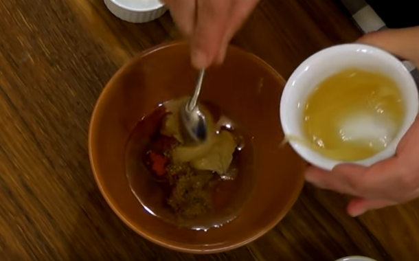 Для маринада в пиалу вливаем масло, кладем мед, обычную и зерновую горчицу и добавляем прессованные зубчики чеснока. Также подсыпаем соль, перец и паприку, тщательно все размешиваем до однородности.