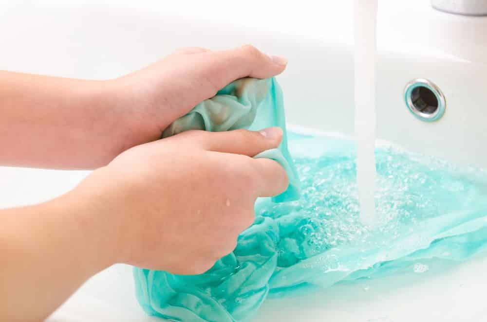 - Изделия сушат над ванной горизонтально, стряхнув воду, без отжима.