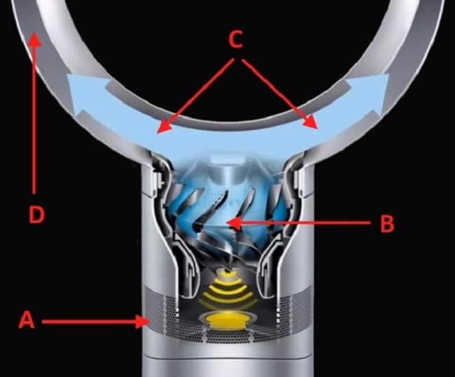 При включении турбина начинает нагнетать воздух внутрь кольца, откуда выходит под давлением в небольшую щель (А на рис. 5) или маленькие сопла.