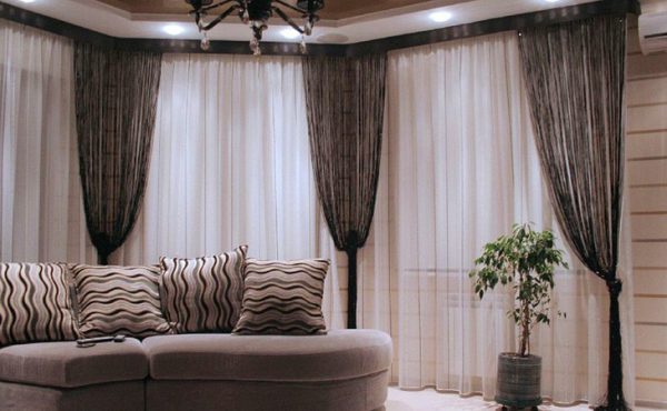 В центре каждого угла неплохо будут смотреться блестящие шторы с плессировкой, окруженные портьерами с орнаментом, и все это – на фоне белых гардин. Другой вариант – тюль с контрастными, элегантно ниспадающими симметричными или асимметричными ламбрекенам до пола.
