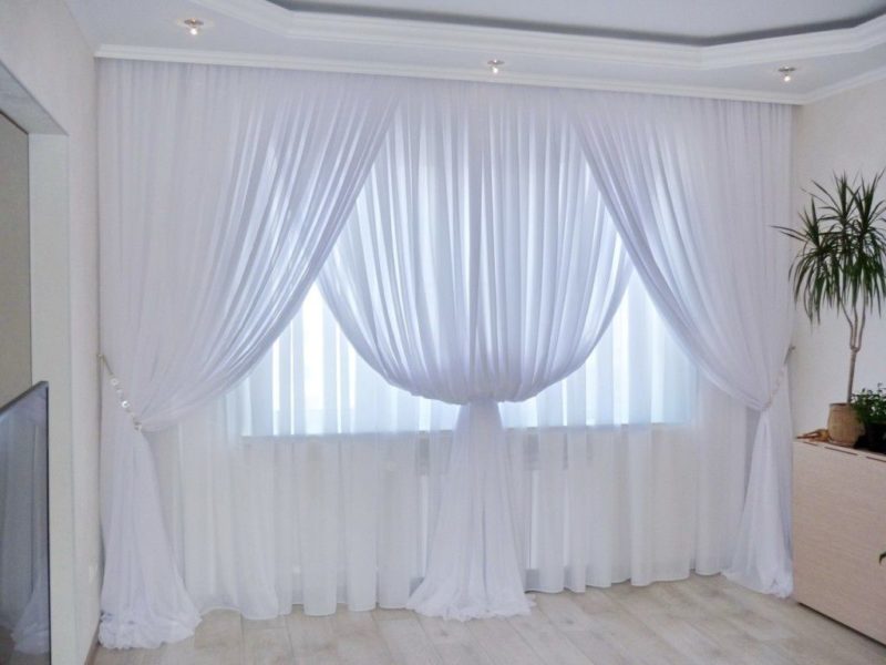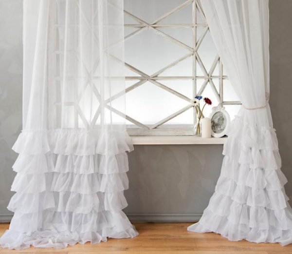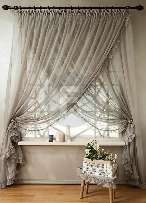 Красивая драпировка с эффектом утяжеления. В этом случае длину тюли делают больше на 20-30 см. При навешивании занавесок их нижний край лежит на полу богатыми складками. Особенно красиво такой эффект смотрится в том случае, если по низу идёт фигурная резка. Если её нет, то при выполнении ролл-обметки ткани можно включить в неё утяжеляющую низ тесьму.