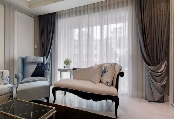 Плотные шторы дополняют шелковым тюлем